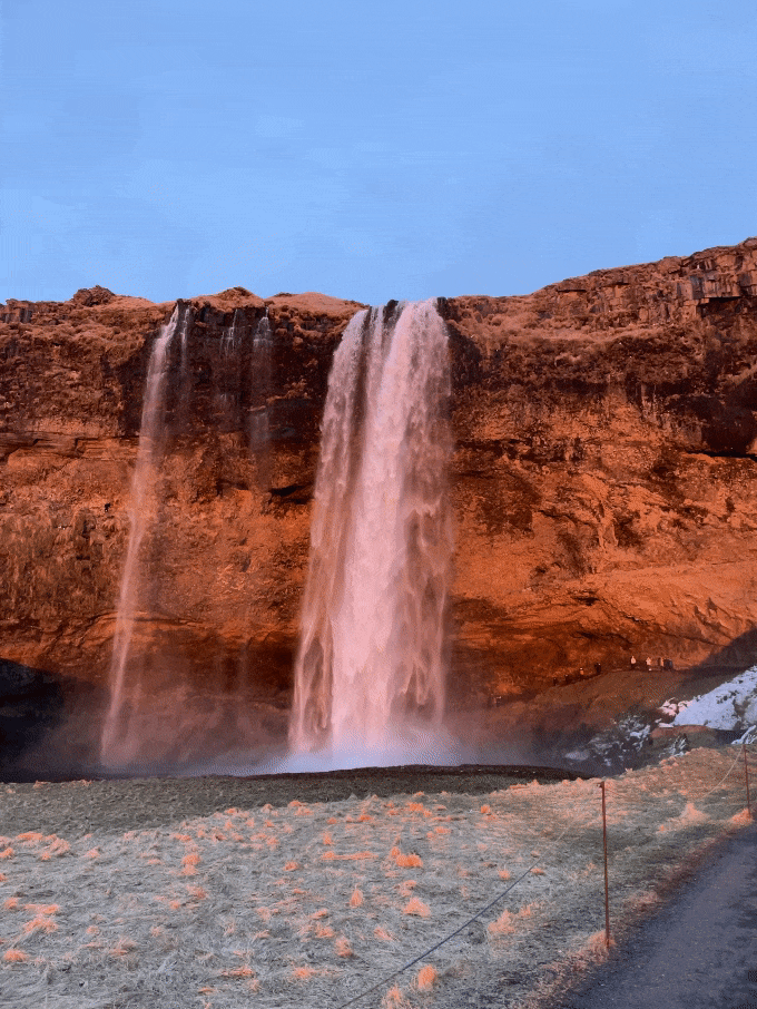 이곳은 제가 아이슬란드에서 가장 기억에 남는 순간을 만들어준 곳이에요. 셀야란즈포스는 폭포 뒤로 가볼 수 있는 유명한 폭포인데요. 셀야란즈포스에 도착했을 땐 현지 시간으로 오후 8시 30분 정도였습니다. 이때 점점 해가 지더라고요. 붉게 물든 폭포의 모습과, 폭포 뒤에서 바라보던 일몰을 잊을 수가 없어요.