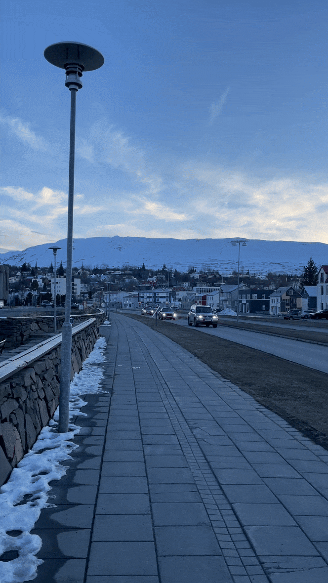 아퀴레이리 도착! 아퀴레이리 공항에서 숙소까지 운동 겸 걸어갔다가 정말 정말 힘들었어요..ㅎ 캐리어는 레이캬비크 버스터미널에 넣어두고 간단한 짐만 챙겨 왔어서 50분 정도야 걸을만하겠지 했다가 후회.. 나중에 알고 보니 차로는 7분 거리라네요! 그러나 가난한 뚜벅이 여행자는 튼튼한 두 다리로 걸을 뿐.. 그래도 신기한 풍경들을 보면서 걸으니 그나마 버틸만했답니다.