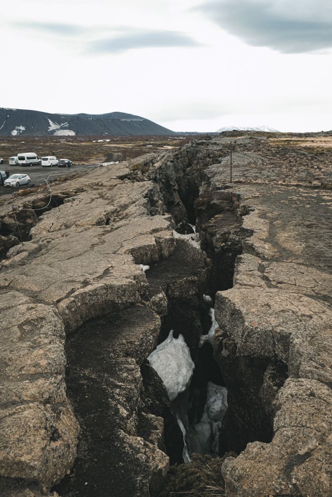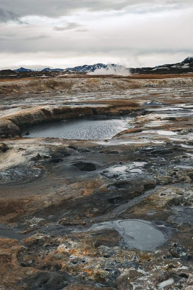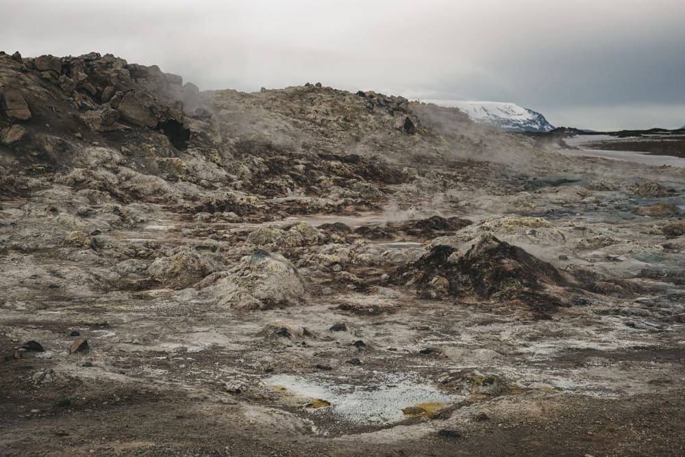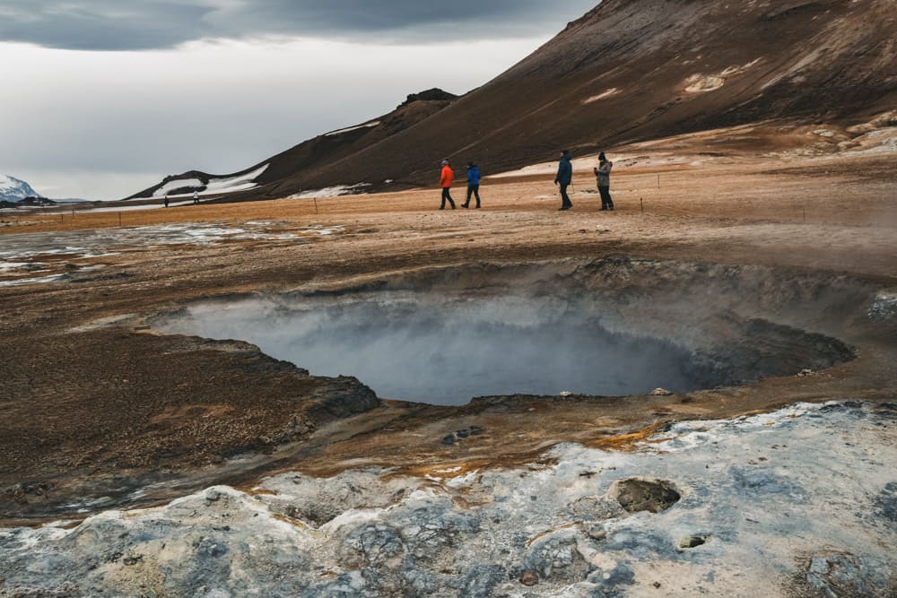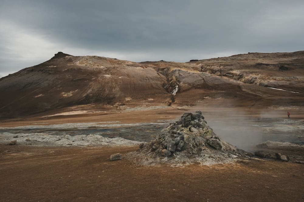 흐베리르는 정말이지 화성에 가보진 못했지만 화성 같다는 표현이 딱 맞는 느낌이었어요. 온통 황토색에 식물이라고는 없었고, 곳곳에서는 펄펄 끓는 구멍들이 있었습니다. 유황 냄새가 엄청 매우 심하게 진동했어요.