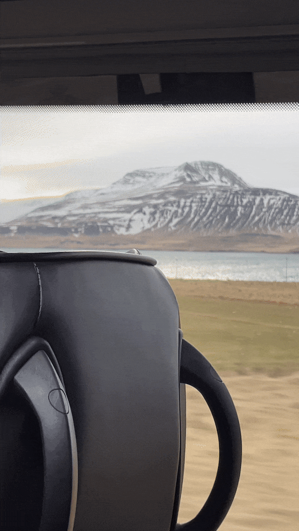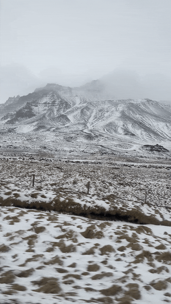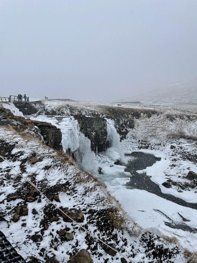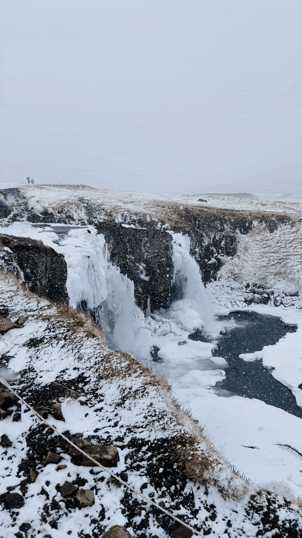 첫 번째 행선지 Grundarfjörður 키르큐펠 방문. 얼음왕국 그 자체 아닌가요. 원래 폭포 뒤로 뾰족한 산봉우리가 보여야 하는데 날씨 때문에 아예 안 보여서 전혀 몰랐어요.. 비몽사몽간에 폭포와 엄청난 눈보라를 마주하고 나서 다시 버스를 타고 이동하면서야 깨달았죠. 생각해 보니 폭포 위치가 키르큐펠이 보이는 그 장소더라고요..! 그 산봉우리를 보고 싶었는데 못 본 게 아쉽지만, 날씨는 어떻게 할 수 있는 영역이 아니니.. 다음을 기약했습니다.