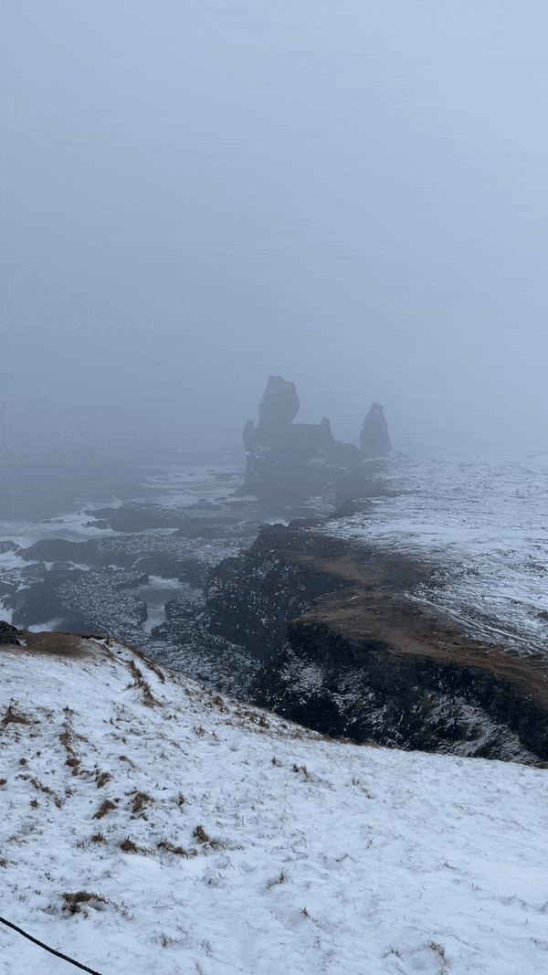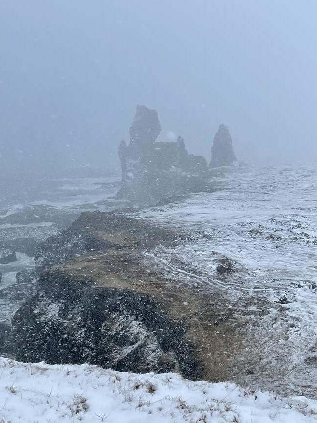 로운트랑가르(Lóndrangar)도 눈보라에 휩싸여 흐릿하게나마 짧게 보았지만, 이 나름대로 엄청난 분위기를 가지고 있었어요.