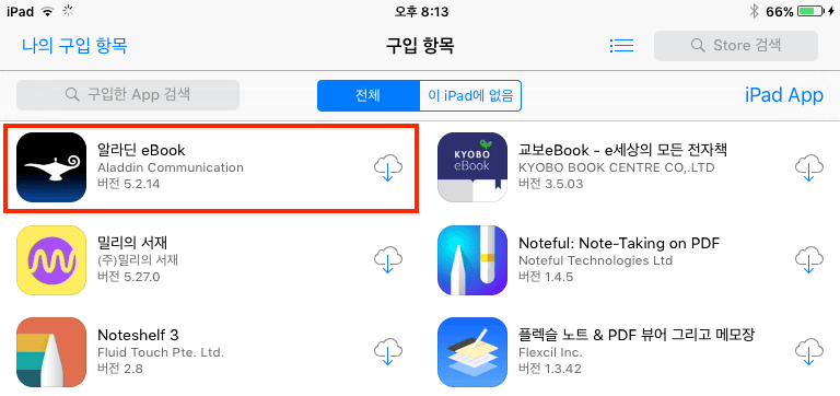 예를 들어 알라딘 eBook을 다운로드하고 싶다고 할게요. 그럼 아래와 같이 먼저 내 폰에 다운로드를 하여줍니다.