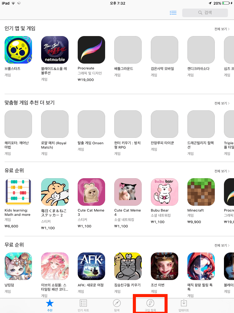 폰에 다운로드하고 나서 다시 아이패드 앱스토어에 들어가 줍니다. 아래에 '구입 항목'이 보이실 텐데요. 이를 눌러 들어가 줍니다.