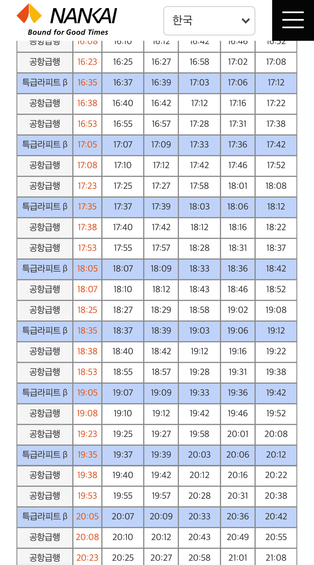 난카이 사이트에 들어가면 출발 시간과 도착 예정시간까지 나와있으니 참고하셔서 탑승 시간을 정하셔도 좋을 것 같네요. '특급라피트'라고 쓰인 파란색 줄이 난카이 라피트 시간표이고요, 공항급행이 위에서 언급했던 일반 공항 급행열차 시간표예요!