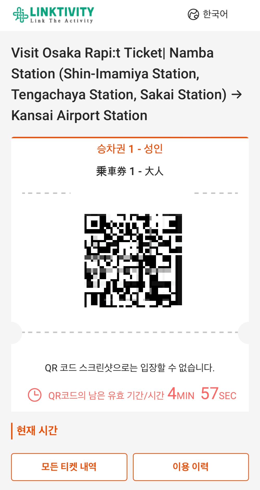 마이리얼트립에서 구매한 난카이 라피트는 E-티켓으로 실물 티켓 교환 없이 QR코드로 바로 탑승할 수 있었기 때문에 더 편리하게 이용했어요.