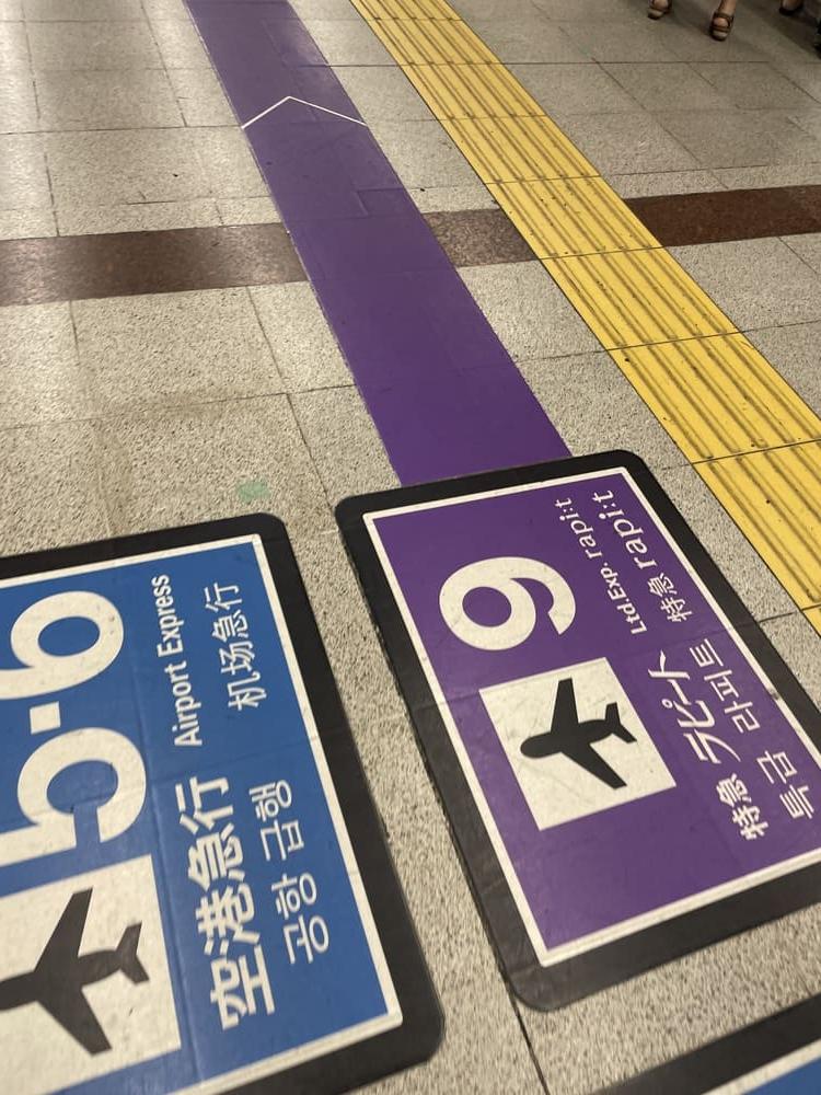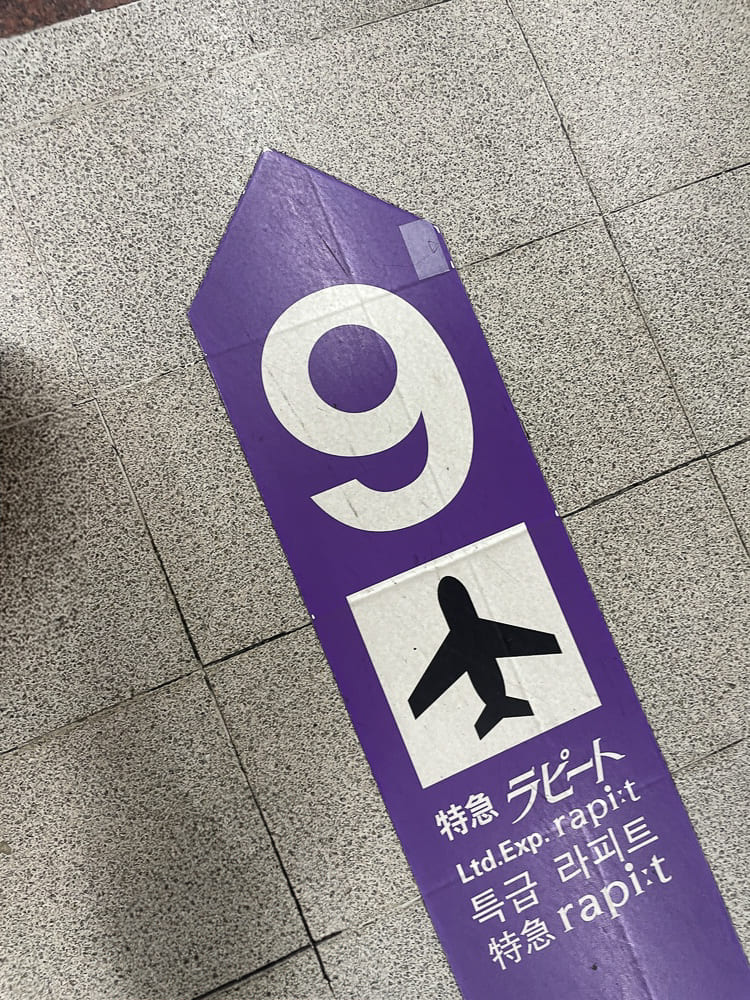 개찰구 맨 왼쪽에 QR코드 찍고 들어가는 곳이 있었고요, 찍고 들어가서도 저 보라색 표지판만 따라가면 길 잃을 일 없이 바로 9번 탑승 플랫폼으로 갑니다.