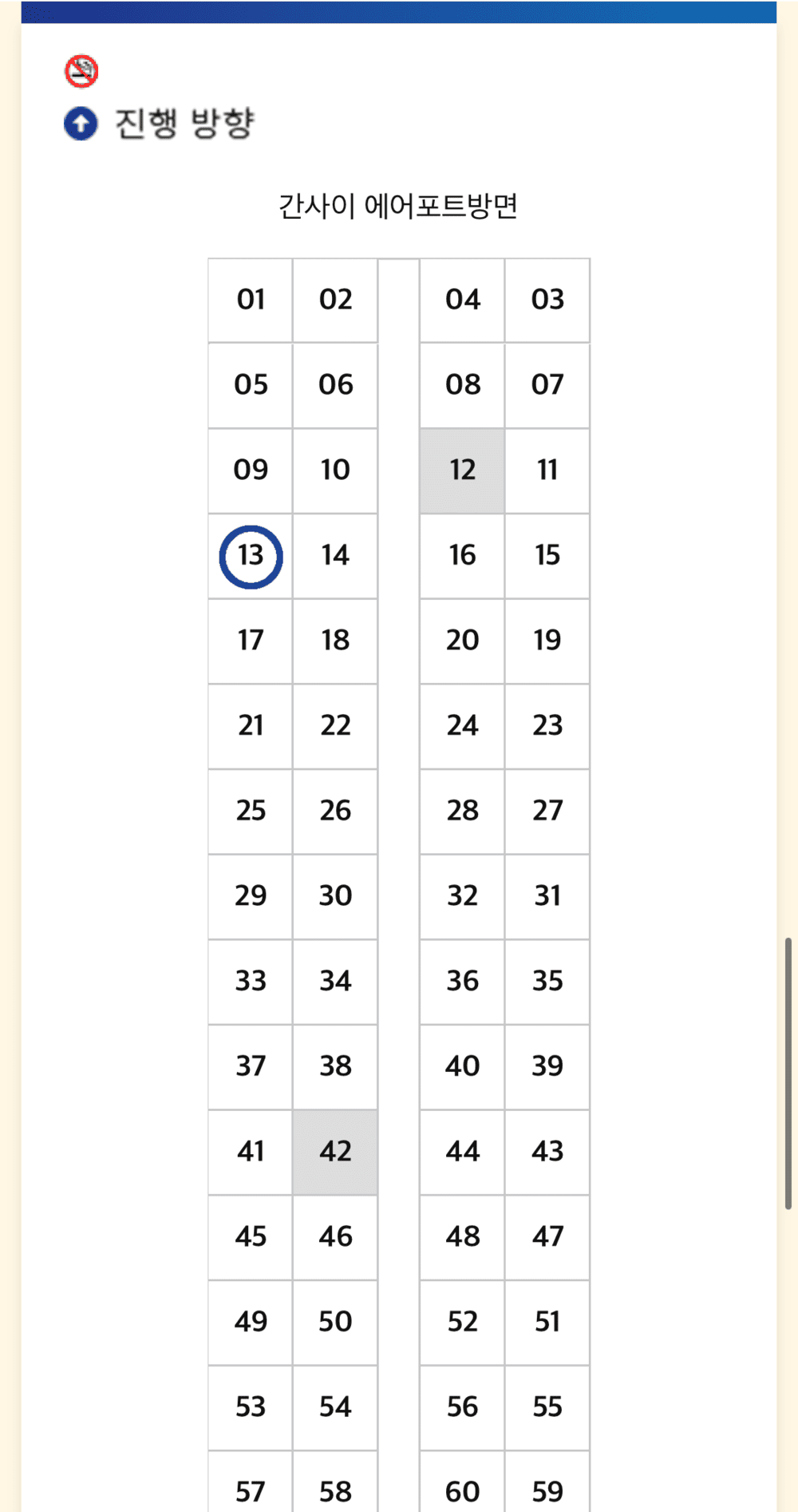 탑승일을 선택해 주시고 대략적인 승차 시간과 승하차 역을 선택한 뒤 '좌석 선택으로' 버튼을 눌러주세요. 우리나라 고속버스 예매하는 거랑 비슷해서 어렵지 않으실 거예요! 시간을 조회하면 그 시간대 즈음 탑승 가능한 열차 시간대가 나와요. 타려는 시간대를 눌러주고 앉고 싶은 좌석을 선택해 주세요.