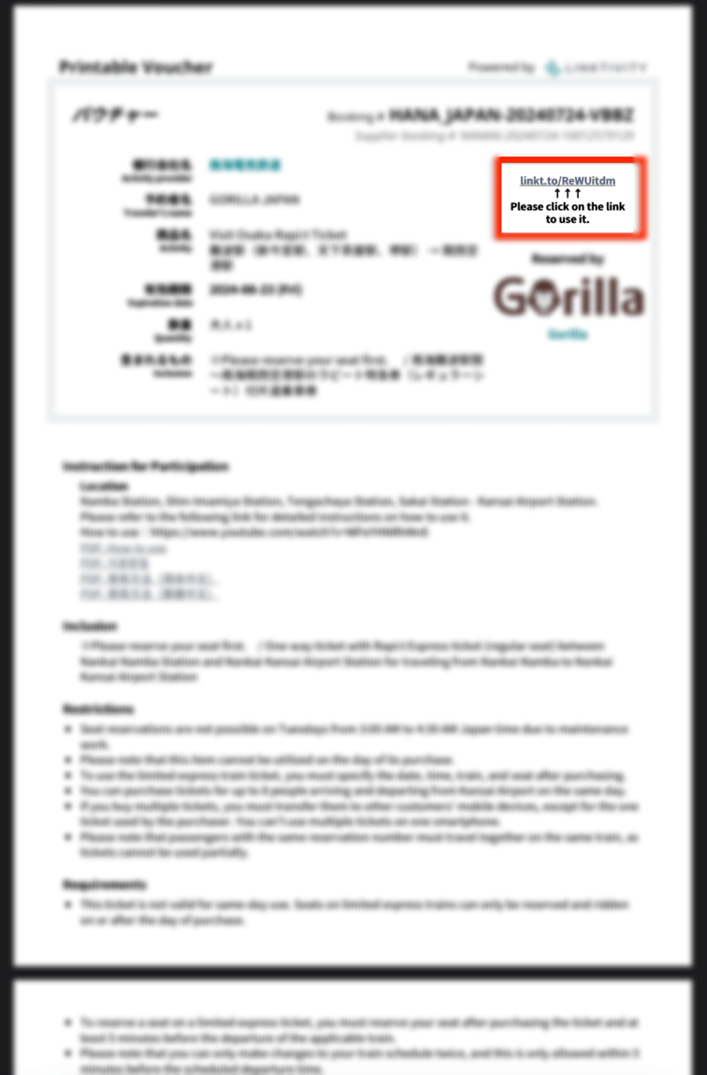 사이트를 통해 예매한 티켓이 확정되면 이메일로 바우처가 날아오는데요. 바우처를 열면 'Please click on the link to use it.'이라고 쓰여있는 부분에 링크가 보이실 거예요. 이 링크를 눌러서 좌석 예약 사이트로 접속해 줍니다.