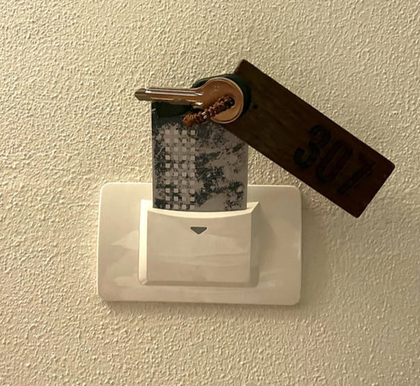 숙소는 열쇠로 열어야 하는데 두 바퀴 정도 돌려야 문이 열리더라고요. 들어가서는 카드 부분을 저기에 꽂아두시면 됩니다.