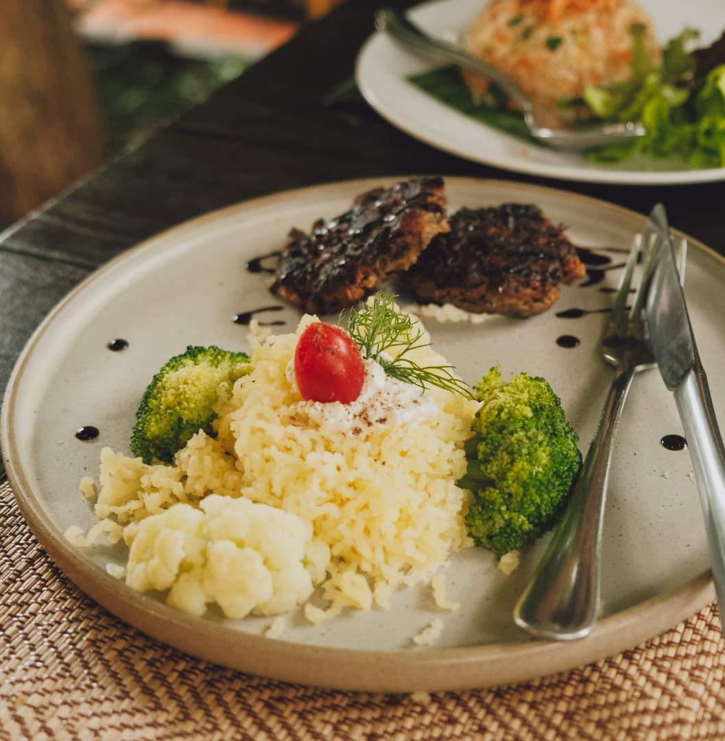 첫날은 이렇게 메뉴 3개에 음료 각자 한 잔씩 먹었어요. 일단 과일이 너무 맛있어서 BIG FRESH FRUIT PLATE 요건 매일 필수로 시켜야 합니다! 버섯 스테이크는 살짝 바삭한 고기 같은 느낌이었고, 앞에 밥처럼 보이는 건 감자였어요. FREID RICE는 개인적으로 특유의 향이 나서 저는 잘 못 먹었지만 친구는 맛있다며 엄청 잘 먹었어요.