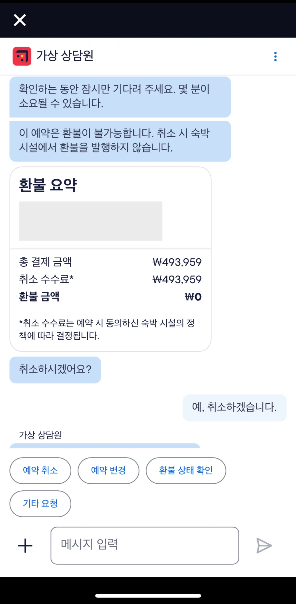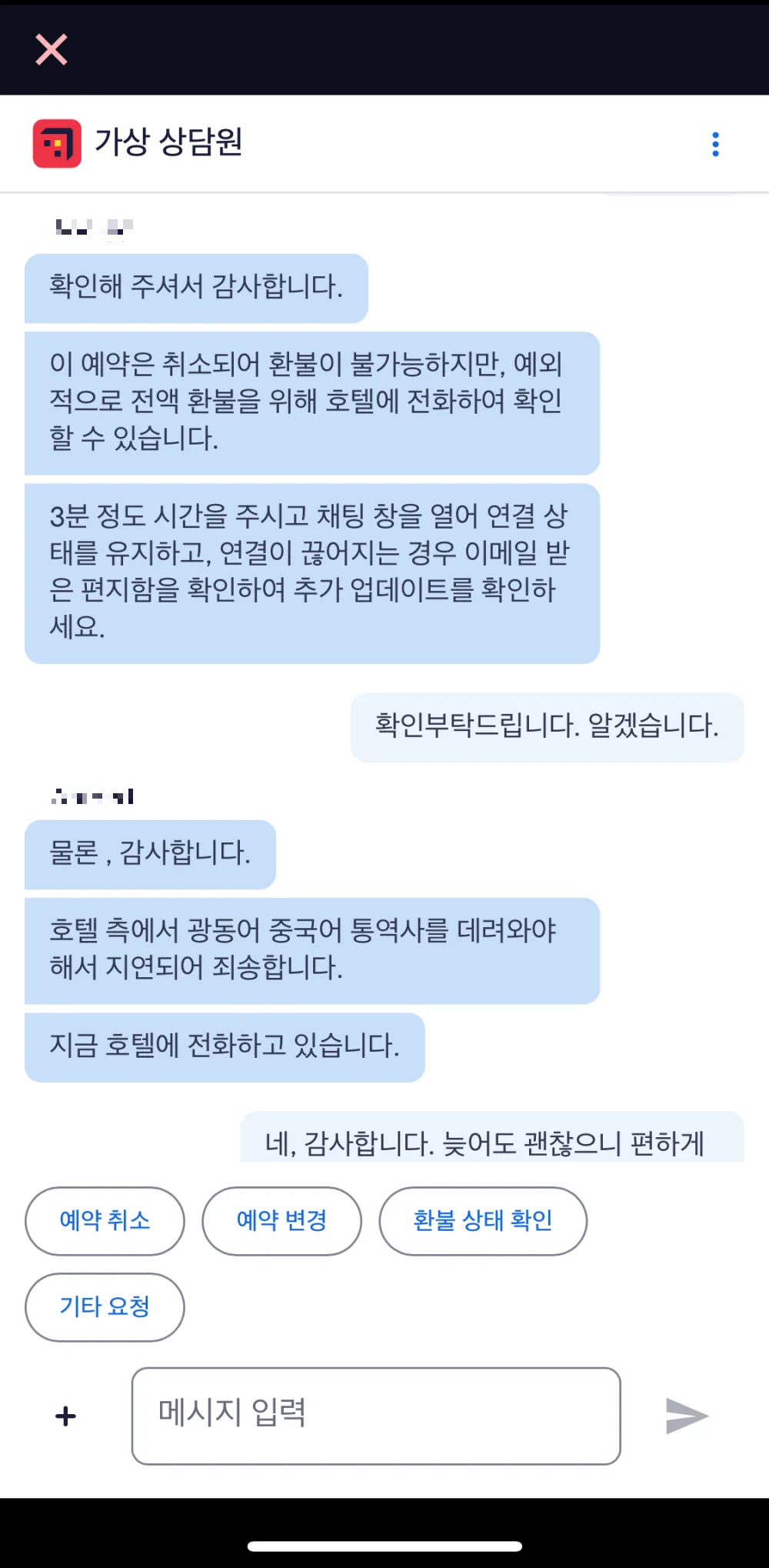 이렇게 인간(?) 상담원과 연결이 되는데요. 일부라도 환불이 가능한지 여쭤보았더니 원래는 이미 취소되어 환불이 불가능하지만 예외적으로 가능할 수 있으니 호텔에 연락을 해보겠다는 답변이 왔습니다.