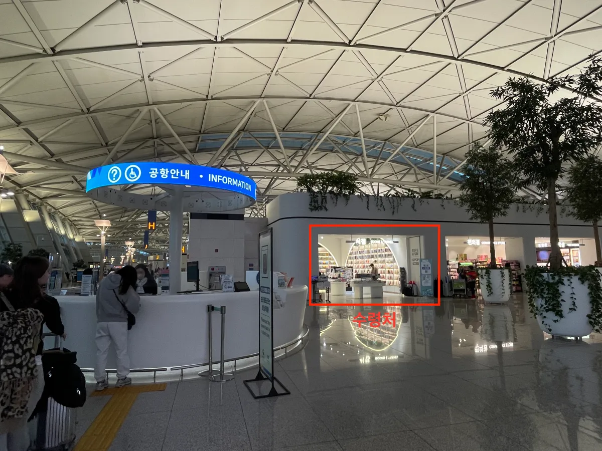 H카운터를 발견하셨다면, 바로 앞에 인포데스크가 보이는데요. 데스크 오른쪽에 서점이 위치해 있습니다.