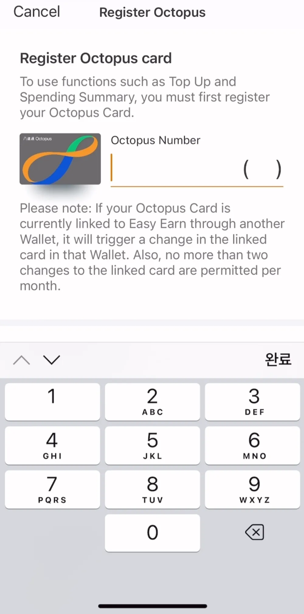 5. 카드 뒷면의 번호를 Octopus Number 빈칸에 입력 후 아래로 스크롤해 Register 클릭