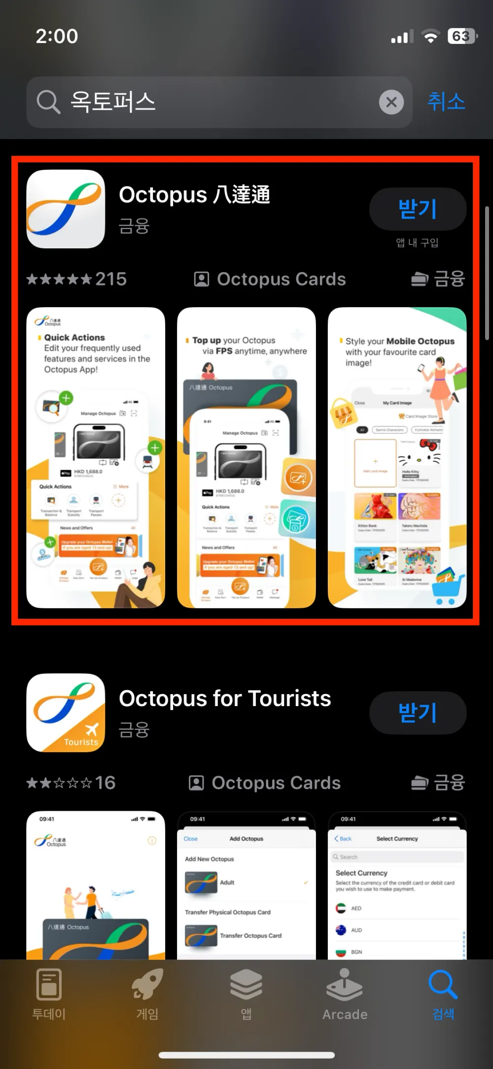 1. 우선 앱스토어에서 '옥토퍼스'라고 검색해 주세요. (한국어로 검색해도 나오더라고요.) 여기서 'Octopus 八達通' 어플을 다운로드해 주세요. (Octopus for Tourists 말고 한자가 적혀 있는 것을 다운로드하셔야 해요!)