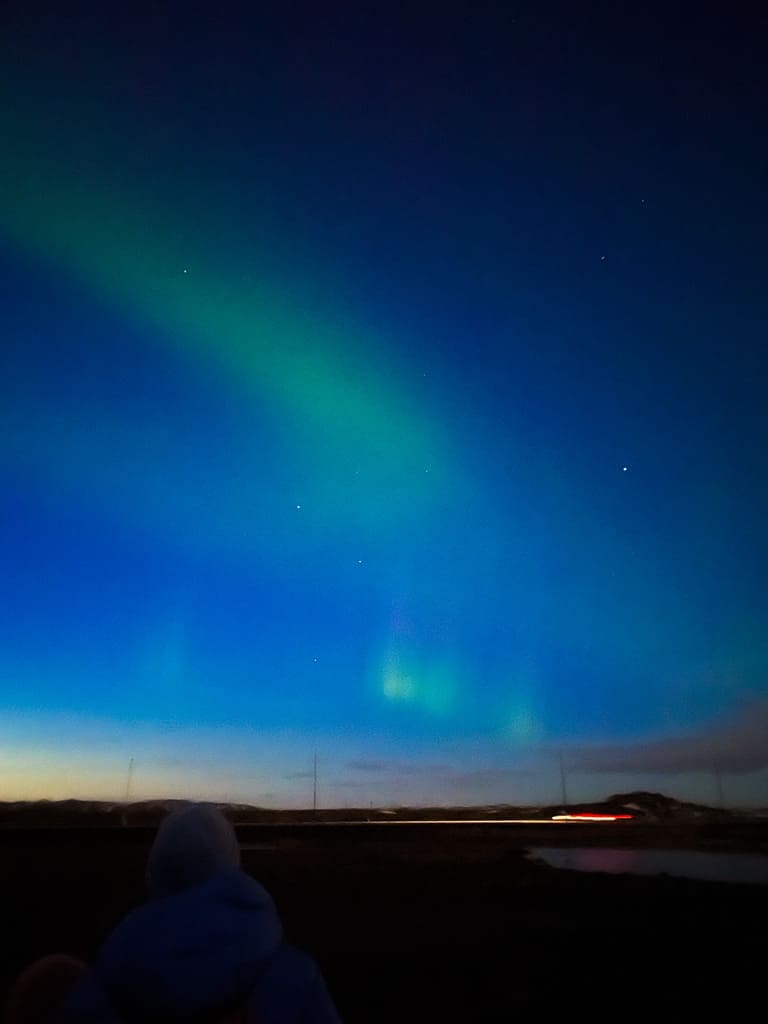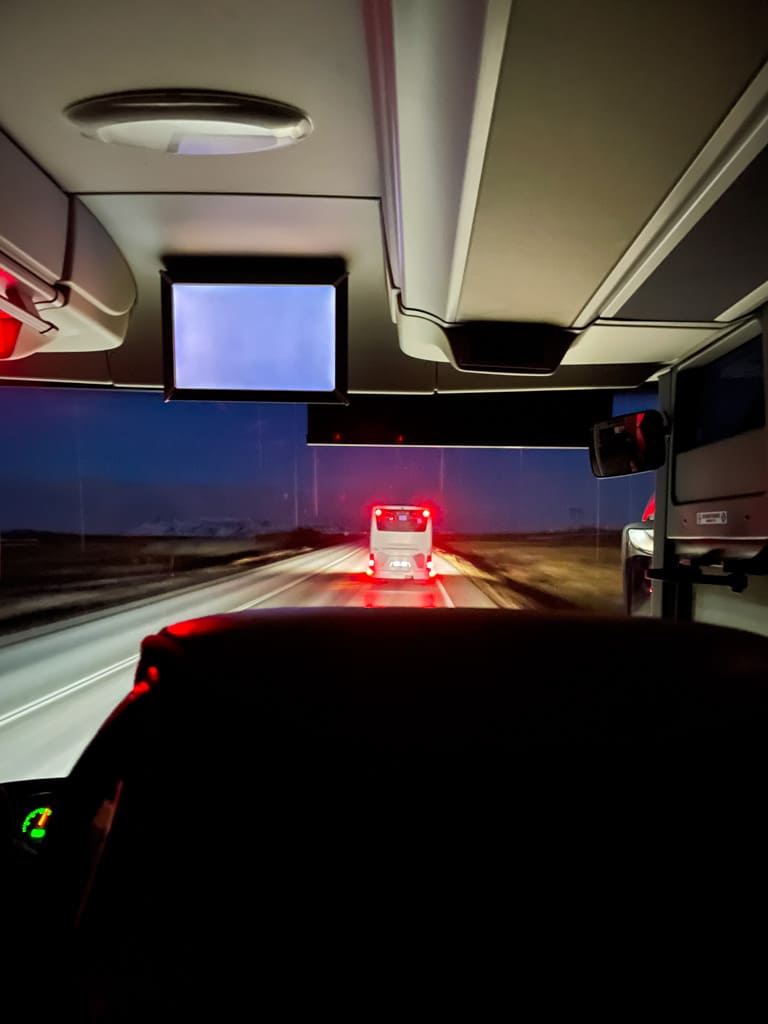 오로라 헌팅 투어는 당일에 오로라 지수가 괜찮은지 보고 출발해요! 다행히도 이 날은 투어가 취소되지 않았는데요. 당일에 가장 오로라가 잘 보이는 곳으로 가는 것 같더라고요. 가는 길에 가이드 분이 오로라를 잘 찍을 수 있는 설정 같은 것도 알려주셔서 좋았어요!